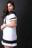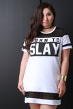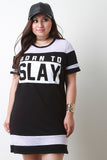 This plus size dress features solid knit main, contrast mesh panels, text print, short sleeves, and mini length. Accessories sold separately. Made in USA. 95% Cotton, 5% Spandex.