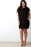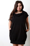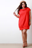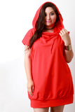 This hip shirt dress features a jersey knit fabrication, cowl neckline with attached back hoodie, self-tie drawstring detail, and two side pockets. Accessories sold separately. Made in U.S.A. 96% Cotton, 4% Spandex.