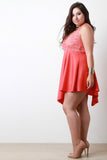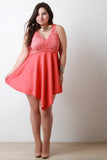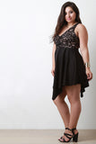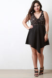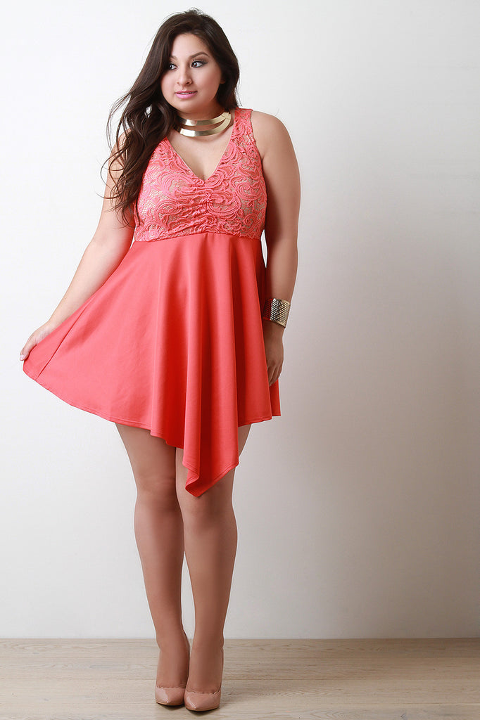 This ultra-glam plus size fit & flare dress features a beautiful floral lace bodice, v neckline, soft padded bra cap, sleeveless design, and flare skirt with angle hem. Partially lined. Accessories sold separately. Made in U.S.A. Self: 90% Nylon, 10% Spandex. Contrast: 95% Polyester, 5% Spandex. Lining: 100% Polyester.