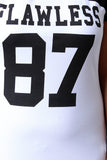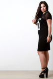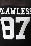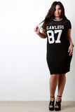 This funky plus size dress features a contrasting mesh and jersey knit fabric, "Flawless 87" graphic print at front, and striped ribbed round neckline. Finished with a midi-length hemline. Accessories sold separately. Made in U.S.A. 95% Cotton, 5% Spandex.