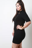 This plus size dress features jersey knit, mock neck, lace-up front, short sleeves, back keyhole cutout with triple button closure at nape, and mini length. 95% Rayon, 5% Spandex.
