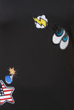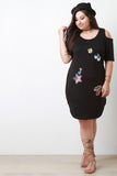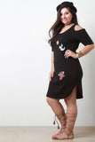 This plus size midi dress features a jersey knit fabrication, assorted embroidered sequin patches at front, scoop neckline, and elbow sleeves with cold shoulder cutouts. Finished with a midi-length hemline. Accessories sold separately. Made in U.S.A. 48% Polyester, 48% Rayon, 4% Spandex.
