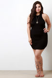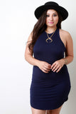 This casual plus size dress features a jersey knit fabrication, round neckline, sleeveless construction, and mini-length rounded hemline. Accessories sold separately. Made in U.S.A. 95% Rayon, 5% Spandex.