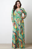 This plus size dress features abstract print, surplice neckline, wrap style design with self-tie straps, long sleeves, and maxi length. Accessories sold separately. Made in USA. 95% Polyester, 5% Spandex.