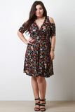 This plus size dress is flare cut, featuring a surplice design with a decor bow-tie and semi elastic waist band. Designed with a v-neckline, cold shoulders, and quarter sleeves. Floral print design throughout. Accessories sold separately. 95% Rayon. 5% Spandex.