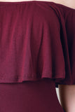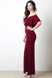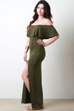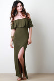This maxi dress features bardot neckline, flutter tier, sculpture fit, and a high vent slit at left side. Accessories sold separately. Made in U.S.A. 95% Polyester, 5% Spandex.