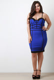 This plus size sleeveless dress features a sweetheart neckline, soft padded caps, contrasting caged trims throughout, and adjustable bra straps. Finished with an exposed back zipper closure and stretchy sculpture fit. Accessories sold separately. Made in U.S.A. 100% Polyester.