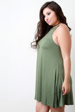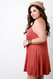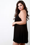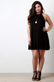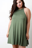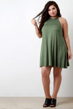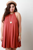This plus size dress features a jersey knit fabrication, halter-designed neckline, and sleeveless construction. Finished with a mini-length hemline and flowy shift cut fit. Accessories sold separately. Made in U.S.A. 92% Rayon, 8% Spandex.