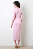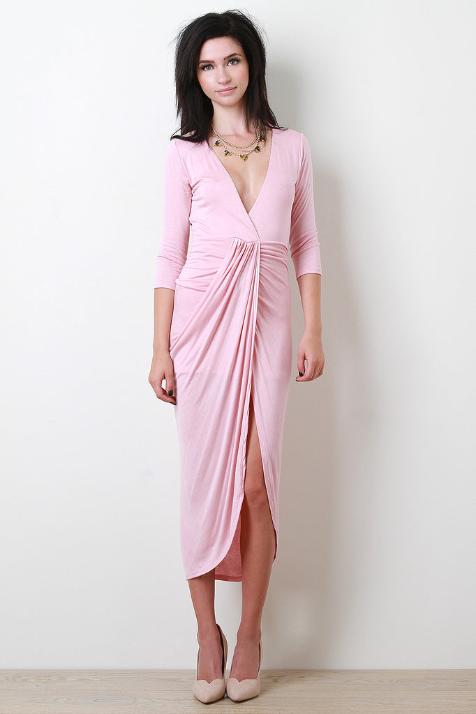 This dress features soft knit, deep v-neckline, long sleeves, elasticized waist, draped design, hidden mini skirt, and finished with asymmetrical hem. Accessories sold separately. Made in U.S.A. 96% Rayon, 4% Spandex.