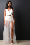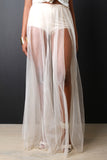 This maxi skirt features an elasticized high rise waist, brief underlay, long flowy semi-sheer mesh maxi, and a high vent slit at left side. Accessories sold separately. Made in U.S.A. 100% Polyester. Contrast: 95% Cotton, 5% Spandex.
