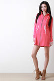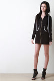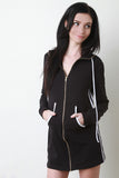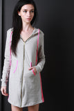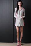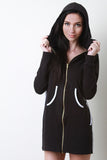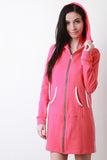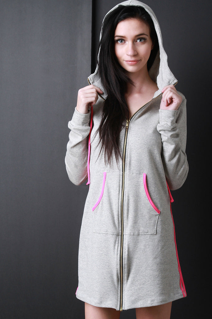 This comfy jersey mini dress features a contrast color trim, attached hood, long cuff sleeves, and full-zip front. Finished with a kangaroo pocket and mini-length skirt. Accessories sold separately. Made in USA. 92% Cotton, 8% Spandex.