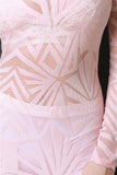 This bodycon dress features a semi-sheer mesh fabrication, stretchy silhouette fit, round neckline, long sleeves and midi length hemline. Made in U.S.A. Accessories sold separately. 90% Nylon, 10% Spandex.