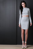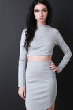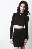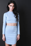 This top features a mock neckline, long sleeves and jersey knit fabrication. Finished with a back zipper and a crop hemline. Accessories sold separately. Made in U.S.A. 67% Rayon, 28% Nylon, 5% Spandex.