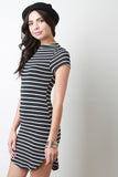 This cute mini dress features horizontal stripe pattern on jersey knit fabrication, boat neckline, short sleeve construction and a rounded hemline. Accessories sold separately. Made in U.S.A. 68% Rayon, 27% Polyester, 5% Spandex.