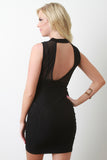 This sleeveless bodycon dress features a semi-sheer mesh fabrication, mock neckline, surplice keyhole back, and spaghetti shoulder strap mini dress underlay. Accessories sold separately. Made in U.S.A. 95% Polyester, 5% Spandex.