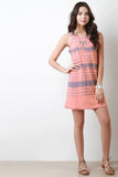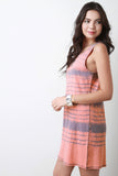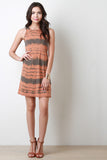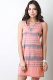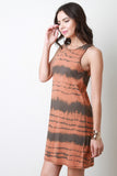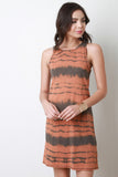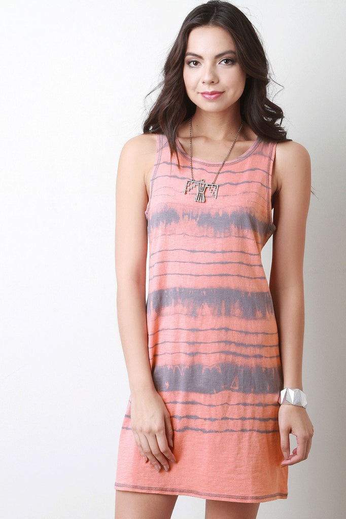 This sleeveless jersey knit dress features a round neckline, slight racer back, tie-dye pattern, and shift cut fit. Accessories sold separately. 60% Polyester, 35% Rayon, 5% Spandex.