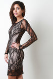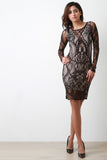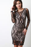 This eye-catching lace , long sleeves design, and stretchy bodycon fit. Accessories sold separately. Partially lined. Made in U.S.A. Self: 90% Polyester, 10% Spandex. Lining: 95% Rayon, 5% Spandex.