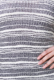This dress features a stripe pattern design, ribbed knit fabrication, sleeveless construction, scoop neckline and back. Finished with a right slit. Accessories sold separately. Made in U.S.A. 51% Rayon, 44% Polyester, 5% Spandex.