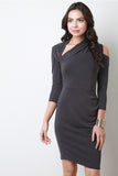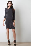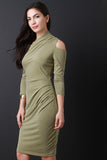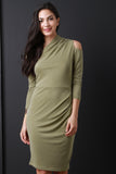 This dress features an asymmetrical design, with a slanted v neckline, one cold shoulder cut out, side pleats on the skirt with soft knit fabrication. Accessories sold separately. Made in U.S.A. 65% Modal, 35% Polyester.