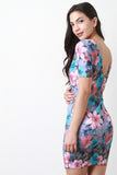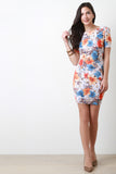 This lovely dress features smooth stretch fabric, floral pattern, round neckline, lightly padded shoulders, short sleeves, and deep v-shaped back. Accessories sold separately. Made in U.S.A. 95% Polyester, 5% Spandex.