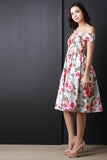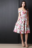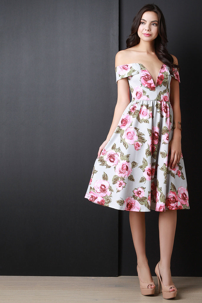 This stylish dress features vibrant roses print on a jersey knit fabrication, structure bardot v-neckline, off the shoulder silhouette, and an a-line skirt. Finished with a mesh and jersey knit underlay. Accessories sold separately. Made in U.S.A. 95% Polyester, 5% Spandex.
