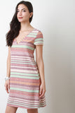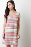 This casual dress features a multi colored striped pattern, rib knit fabrication, deep V-neckline, deep V back, A-line cut and a tie closure at the nape. Accessories sold separately. Made in U.S.A. 51% Rayon, 44% Polyester, 5% Spandex.