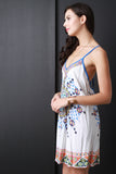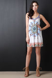 This boho style shift dress features tribal print, deep v-neckline, adjustable spaghetti straps that criss-cross at back, and relaxed fit. Accessories sold separately. 100% Rayon.