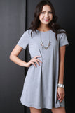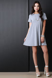 This casual dress features a rounded neckline,short sleeves, an open lace up back, with a relaxed fit, finished with flare hem. Accessories sold separately. 94% Rayon 6% spandex.