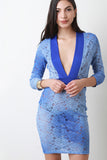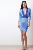 This bodycon dress features a semi-sheer floral lace fabrication, deep v-neckline with contrasting trimming, high waisted cinched panel seam, and quarter-length sleeves. Accessories sold separately. Made in U.S.A. 98 % Polyester, 2% Spandex.