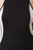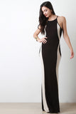 This mod maxi dress features a sleeveless design, spaghetti straps, contrast curved side panels, back keyhole, finished with a button at nape. Accessories sold separately. Made in U.S.A. 95% Rayon, 5% Spandex.