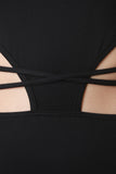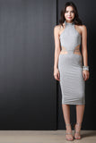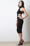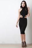 This sexy dress features a mock neckline, shoulder and midriff cut outs, warp around decorative ties, and a midi length hemline. Accessories sold separately. 95% Rayon, 5% Spandex.