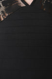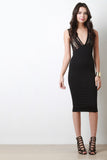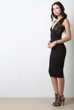 This dress features a semi-sheer mesh pattern top with contrasting pleated knit bottom, deep v-neckline, and sleeveless fit. Finished with a midi-length hemline. Accessories sold separately. Made in U.S.A. 96% Polyester, 4% Spandex.