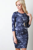 This stylish dress features a smooth stretchy knit fabrication, stained demin style print, round neckline, and three quarter sleeves. Finished with a mini-length hemline. Accessories sold separately. Made in U.S.A. 95% Polyester, 5% Spandex.