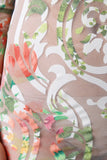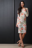 This semi sheer bodycon dress features a boat neckline, long sleeves, stretch mesh fabrication, printed floral pattern, midi length hemline. Accessories sold separately. 60% Polyester 40% Nylon.