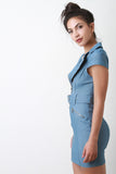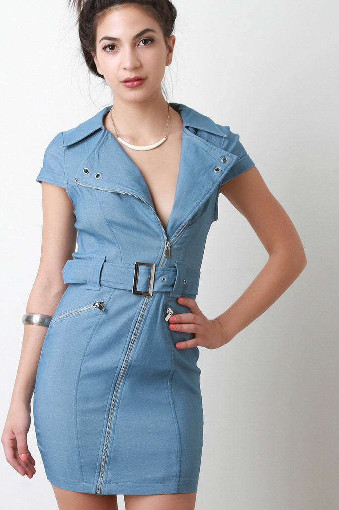 This chambray denim bodycon dress features a diagonal zipper front to a notch collar neckline, short sleeves, princess seam for a more sculpture fit, side zipper d�cor, and high lighted with a buckle belt. Accessories sold separately. 95% Polyester, 5% Spandex.
