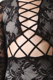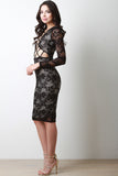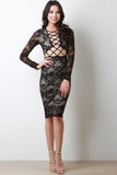 This midi dress features a semi-sheer floral lace fabrication, nude underlay, corset caged front, and long sleeves. Accessories sold separately. Made in U.S.A. 90% Nylon, 10% Spandex.