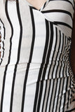 This maxi dress features a surplice neckline, double spaghetti shoulder straps to a crisscross back, wrap inspired design with ruched seam side, asymmetrical vent hemline, and stripe pattern print. Accessories sold separately. Made in U.S.A. 96% Viscose, 4% Spandex.