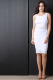 This sleeveless top features a texture knit fabrication, high round neckline, scoop back, scallop hemline and eyelet design accent. Accessories sold separately. Made in U.S.A. 96% Polyester, 4% Spandex.