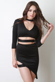 This sexy bodycon dress features smooth stretch fabric, deep v-neck, neck strap, cut out design, 3/4 length sleeves, back zipper closure, and asymmetrical hemline. Accessories sold separately. Made in USA. 96% Polyester, 4% Spandex.