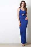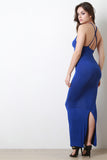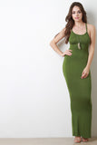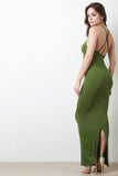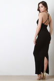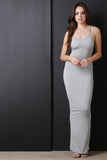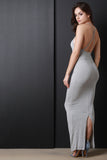 This simple yet sexy maxi dress features a scoop neckline, open back design, cross back spaghetti straps, curve hugging bodycon fit, soft knit fabrication, back knee high slit. Accessories sold separately. Made in U.S.A. 95% Rayon, 5% Spandex.