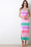 This maxi dress features tie dye jersey knit, deep v-neckline, and two side slits. Accessories sold separately. Made in USA. 96% Rayon, 4% Spandex.