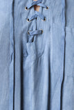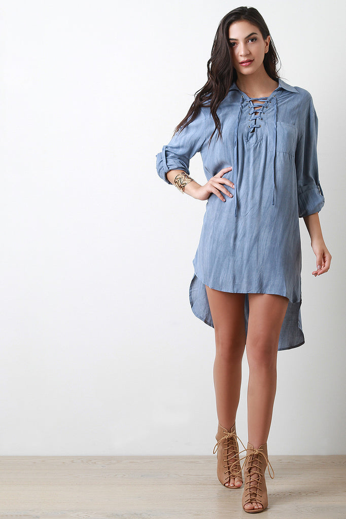 This casual shirt dress features a lightweight chambray fabrication, lace up v neckline, collar, long sleeves with roll up button closure, and a high low rounded hemline. Accessories sold separately. 100% Rayon