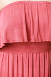 This jersey knit maxi dress features a tie dye hemline, tube top neckline with flounce layer tier, cinched smock waist, and keyhole at back. Accessories sold separately. 95% Rayon, 5% Spandex.