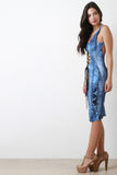 This bodycon dress features a scooped v-neckline, sleeveless design, front teardrop cutout with lace-up detail, and stretchy sculpture fit. Partially lined. Accessories sold separately. Made in U.S.A. 95% Polyester, 5% Spandex.