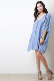 This over-sized shift dress features a woven fabrication, wide boxy cut, lace trim v- neckline, gather details, raglan sleeves, elastic armholes, and a mini length hemline. Accessories sold separately. Made in U.S.A. 100% Cotton.