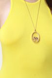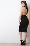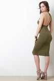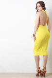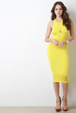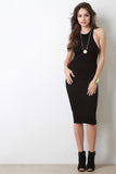 This knit midi dress features an asymmetrical racerback, mock neckline, and stretchy sculpture fit. Accessories sold separately. Made in U.S.A. 95% Rayon, 5% Spandex.