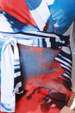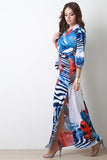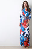 This gorgeous dress features a colorful floral print throughout, surplice v-neckline, attached self-tie waist sash, three quarter sleeves with gather detail, and maxi-length hemline with a single thigh high slit. Accessories sold separately. Made in U.S.A. 95% Polyester, 5% Spandex.