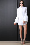 This chic casual dress features a mandarin collar, button up front closure, princess seams, loose relaxed fit, long bell sleeves and a rounded mini length hemline. Accessories sold separately. Made in U.S.A. 100% Cotton.