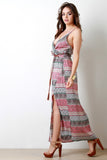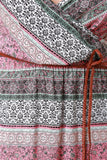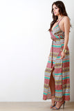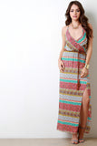 This colorful maxi dress features a woven knit fabrication, boho-inspired print, surplice v-neckline, faux wrap design, and thin shoulder straps to a crisscross back detail. Finished with a front high slit, cinched elasticized waist and includes a tassel-tipped braided belt. Accessories sold separately. Made in U.S.A. 100% Rayon.