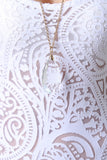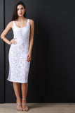 This midi dress features a knit fabrication with a burn out lace design, scoop neckline, sleeveless design, low cut back, double side slits, and a curve hugging fit. Accessories sold separately. Made in U.S.A. 82% Polyester, 18% Nylon.